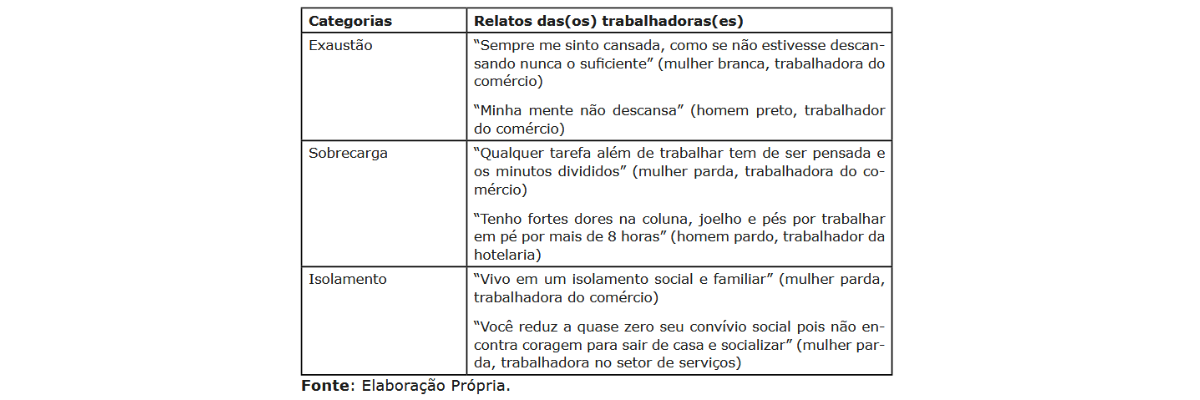 Para a análise das respostas à pergunta aberta, os dados foram sistematizados em três categorias que caracterizam a rotina na escala: a exaustão física e mental, relatada no extremo cansaço e na irritabilidade; a sobrecarga física e mental, exposta nos relatos como a constante administração do pouco tempo fora do trabalho e da sobrecarga do corpo pelas horas de trabalho; e o isolamento, com o estreitamento afetivo e de horizonte, em relatos que indicam desânimo e impossibilidade de planejar o futuro. Essas categorias se entrelaçam no relato de uma trabalhadora do comércio, mulher preta, que afirma: “vivo apenas para trabalhar”. O Quadro 1 busca classificar os relatos das(os) trabalhadoras(es) nessas categorias: