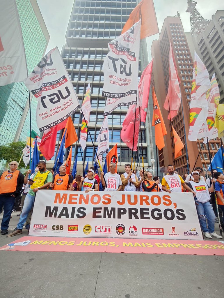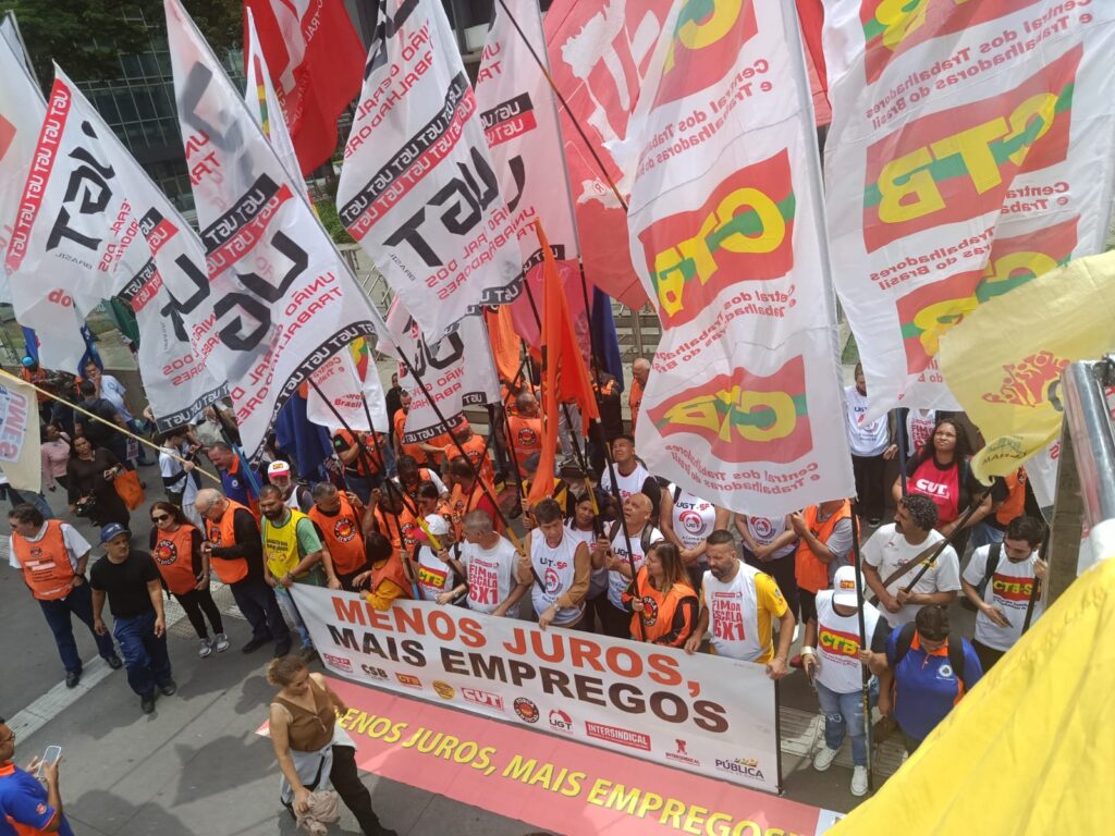 Centenas de trabalhadores e dirigentes das principais centrais sindicais — Força Sindical, CUT, UGT, CTB, CSB e Nova Central — ocuparam nesta terça-feira (4) a frente da sede do Banco Central, na Avenida Paulista, em São Paulo. O protesto teve como principal bandeira a redução imediata da taxa básica de juros, a Selic, atualmente em 15% ao ano — o maior patamar desde 2006.